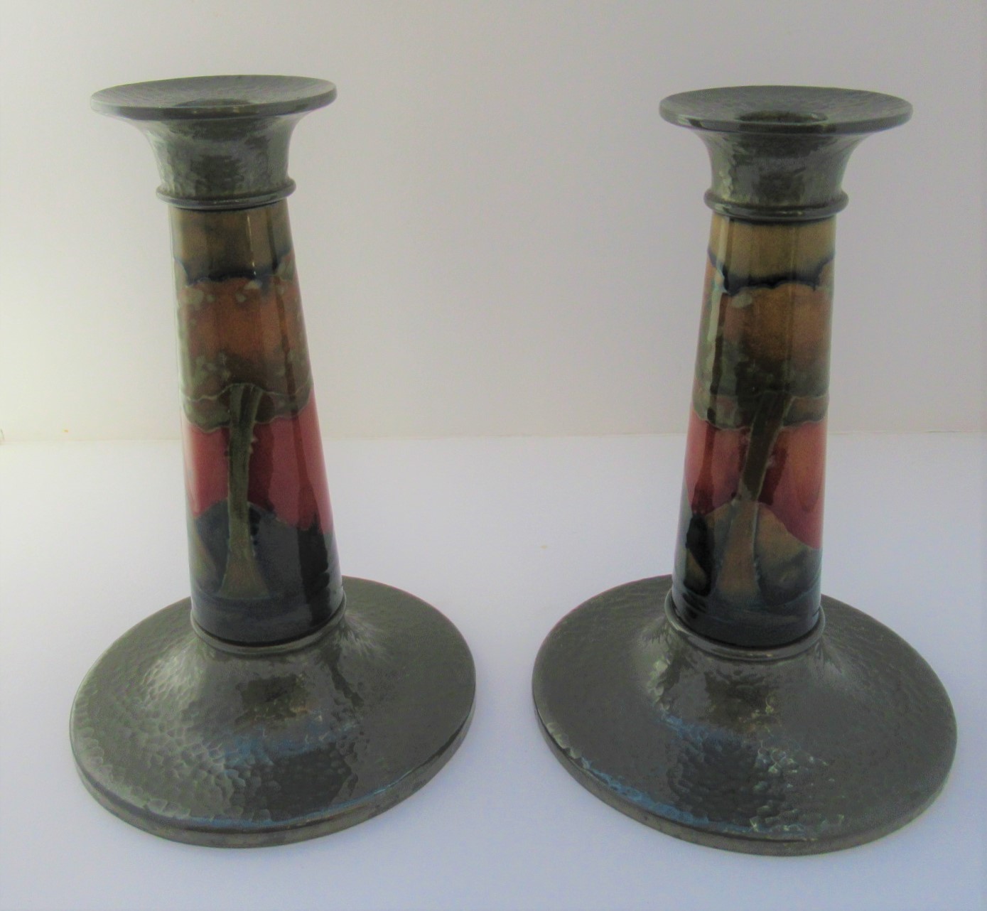 Moorcroft, Liberty Tudric, Eventide Design Candlesticks C.1920