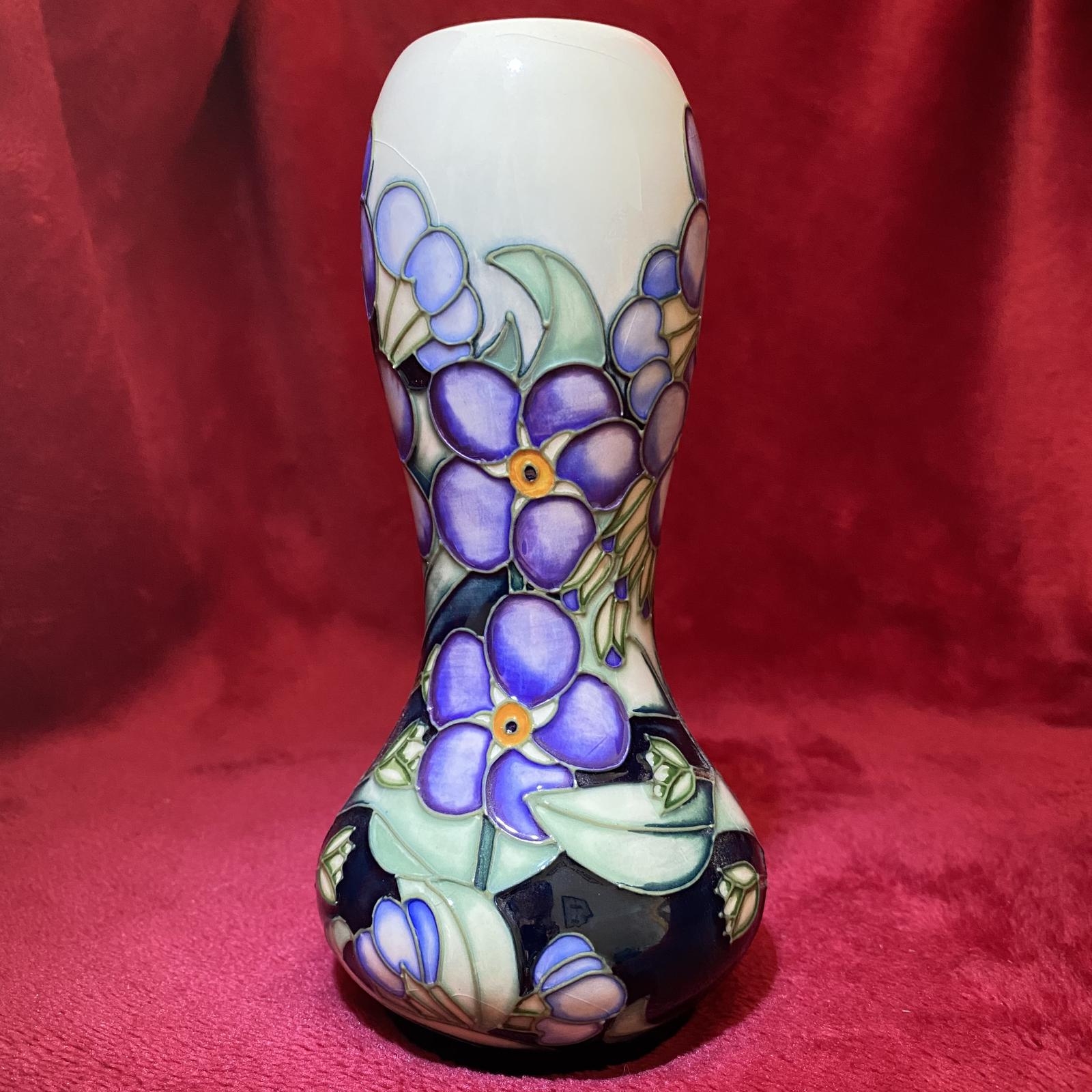 Moorcroft Pottery double gourd vase decorated with Forget Me Nots, signed and numbered with its original Box