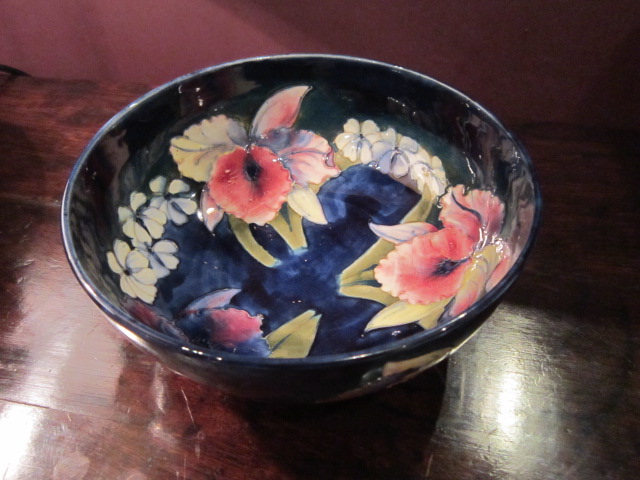 Moorcroft Slipper Orchid on Blue Bowl