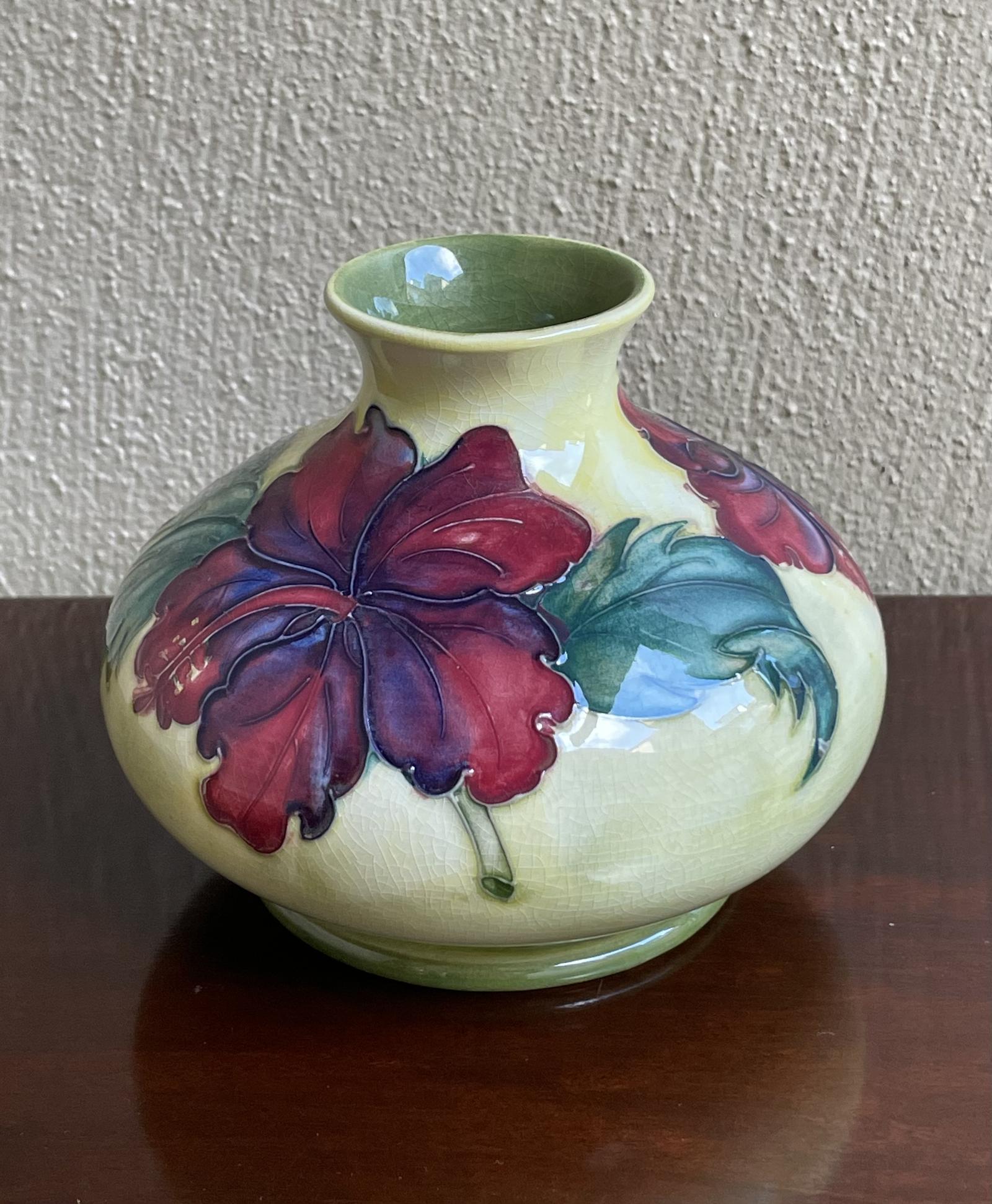 Moorcroft Squat Vase Hibiscus Pattern on Yellow Background