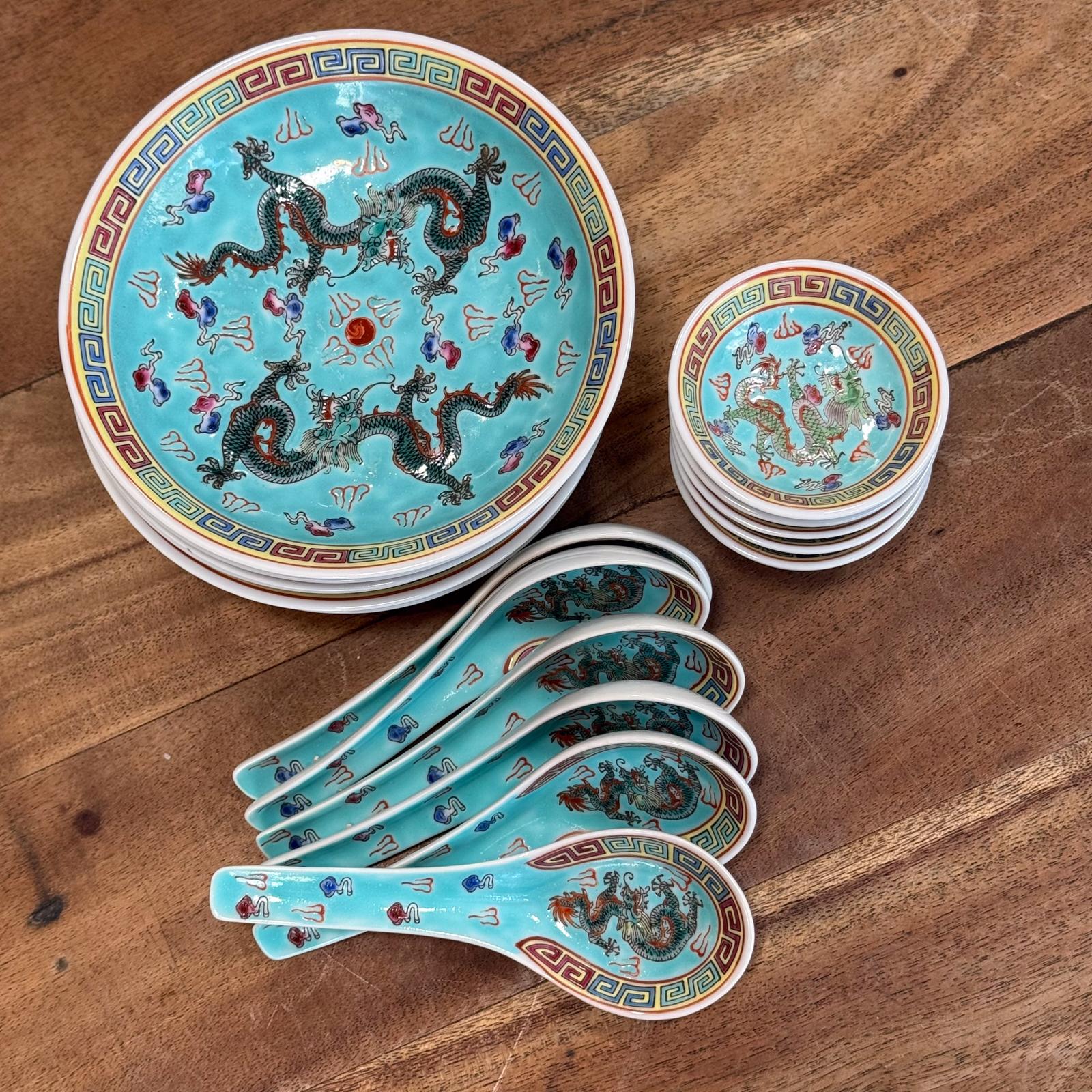 Mun Shou Famille Rose Longevity Porcelain Bowl, Spoon & Sake Cup Set