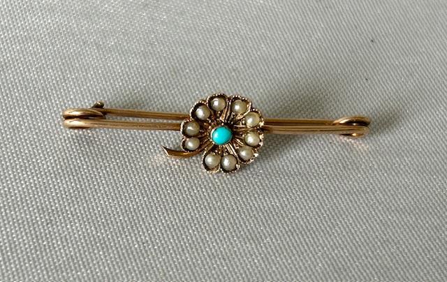 This Murrle Bennet 9ct Gold, Seed Pearl & Turquoise Brooch is located in Suffolk, United Kingdom
