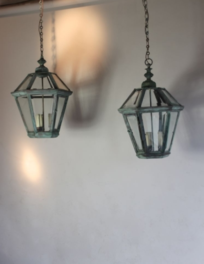 Near Pair of 1930s Verdigris Bronze Hall Lanterns