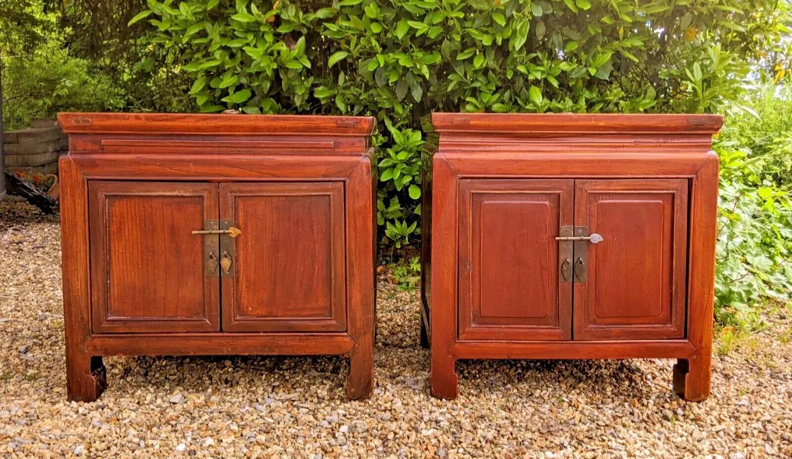 Neat Near Pair of Chinese Hardwood Bedside Cabinets
