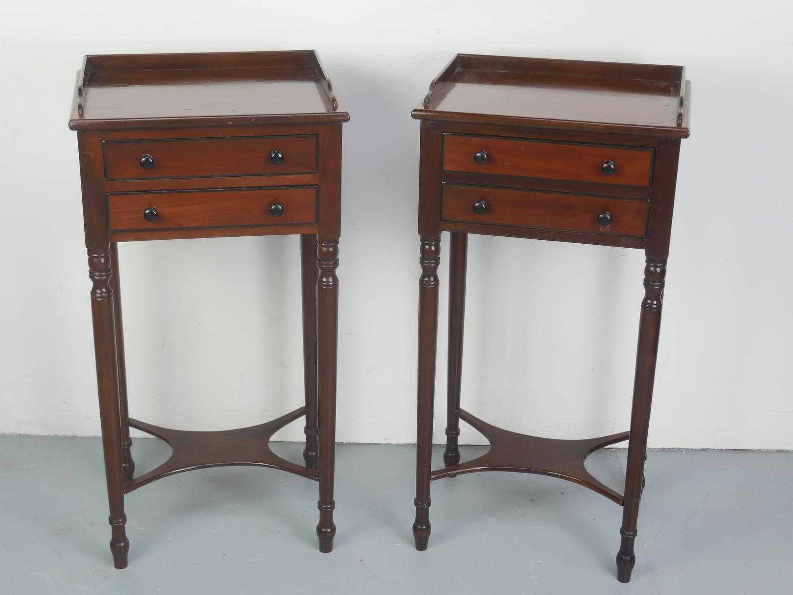 This is a neat pair of bedside side tables, each measuring 37 cm wide. A well-made pair of tables with ebonized handles and edging of the drawers. Mahogany lined drawers, standing on well turned legs with supporting stretchers, finished with a fine gallery. Minor marks to one top, as photo, both in good strong condition.