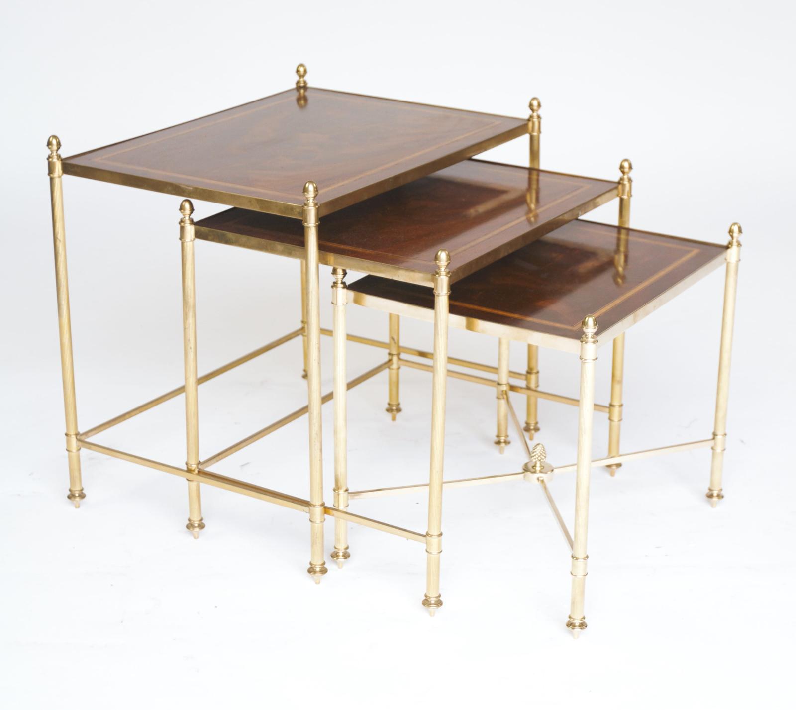 Nest of 3 Brass & Mahogany Inlaid Tables c.1930