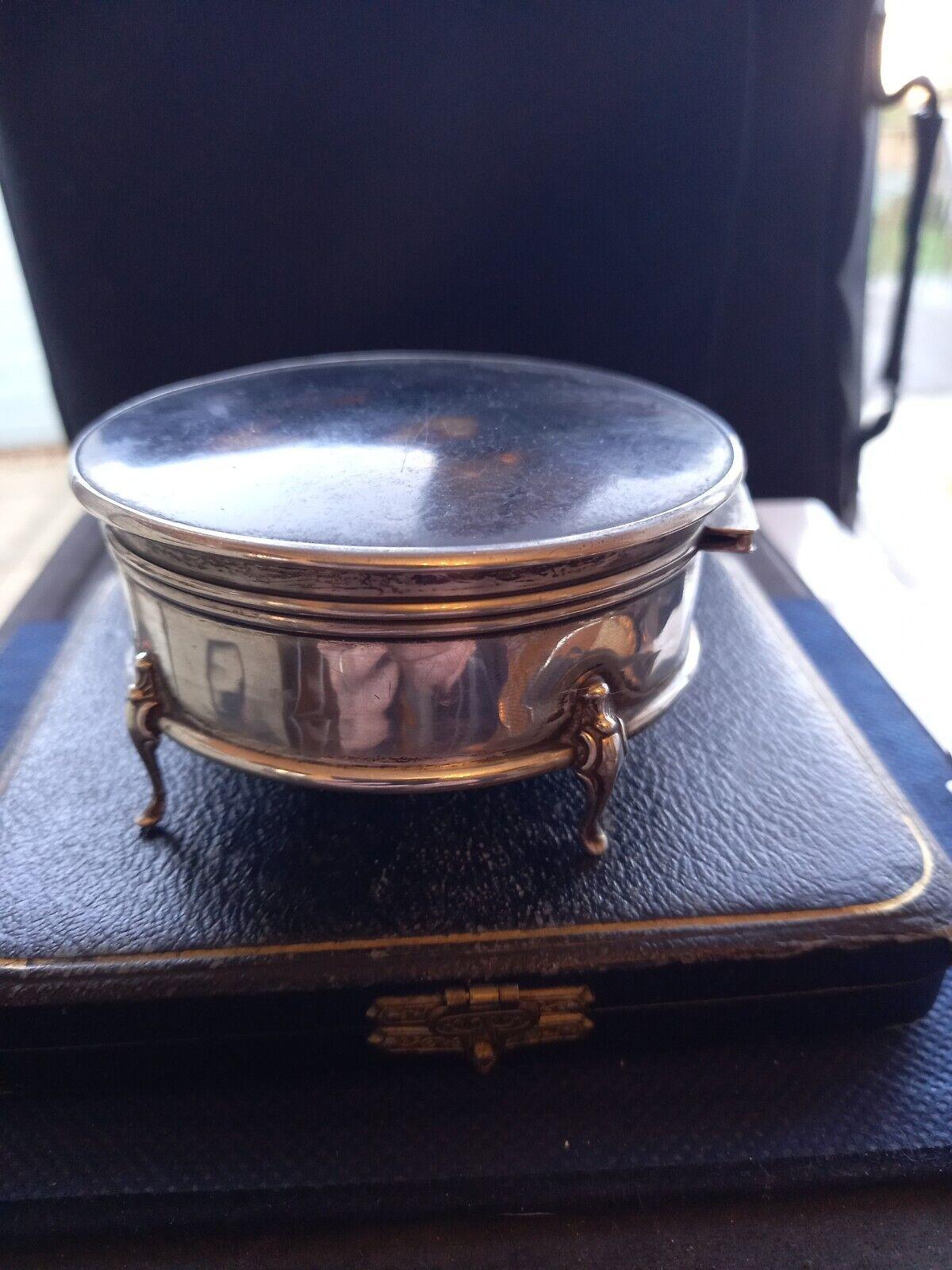 Nice Antique Solid Silver Circular Ring Trinket Box on 4 Legs Birmingham 1922