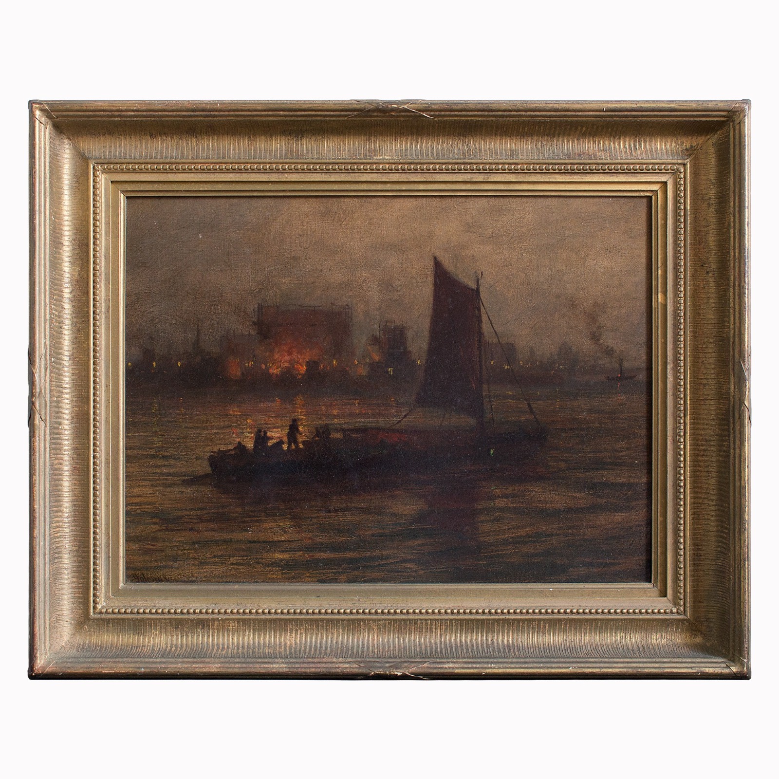 Night Fire, 19th Century Continental Harbour Scene, Oil Painting