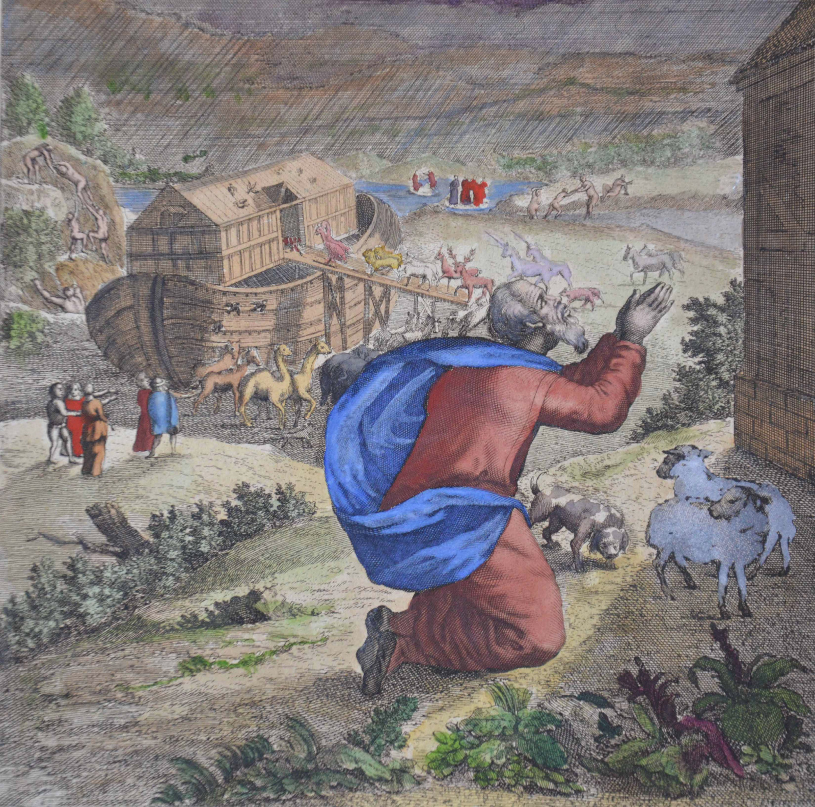 Noah + the Ark Pair of Engravings by Richard Blome 1690 Hand Coloured