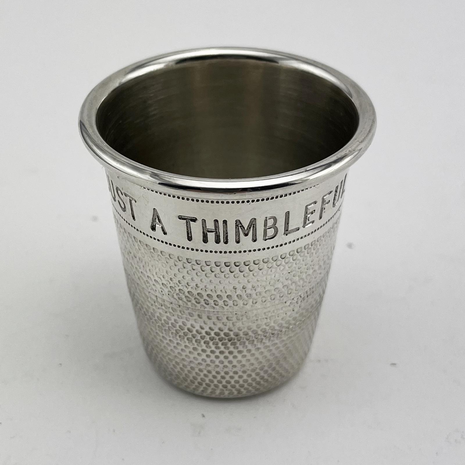 A novelty P. H. Vogel & Co sterling silver drinks measure in the form of a sewing thimble. Engraved with 'Just a Thimble Full'. Very good clean useable condition. Capacity: 2 Fl Oz