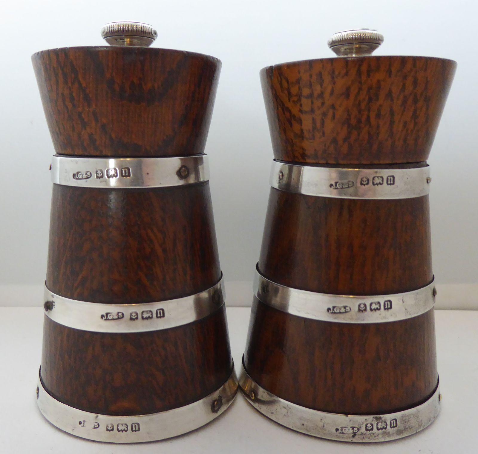 Oak & 1912 Solid Hallmarked Silver Cruet Set Salt & Pepper Grinders Mills