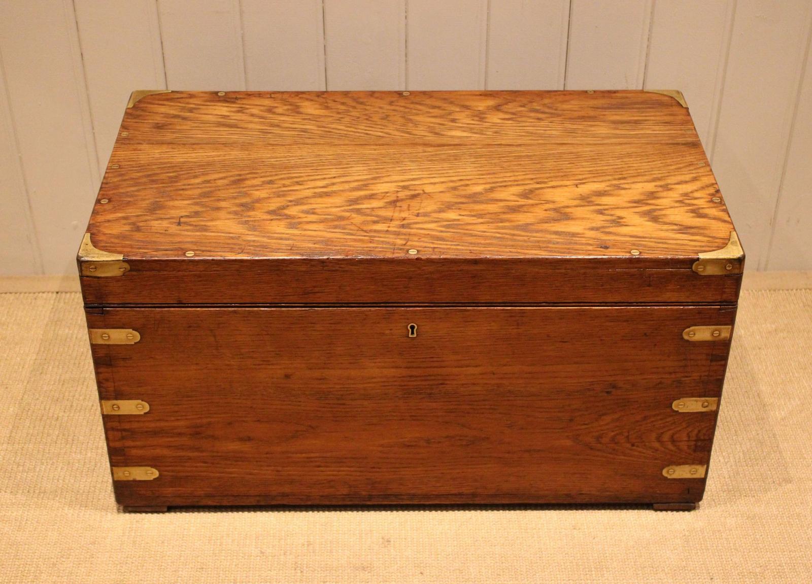 Late 19th century solid oak brass bound trunk having handles to each side , with a hinged lid . The internal depth is 29 cm .