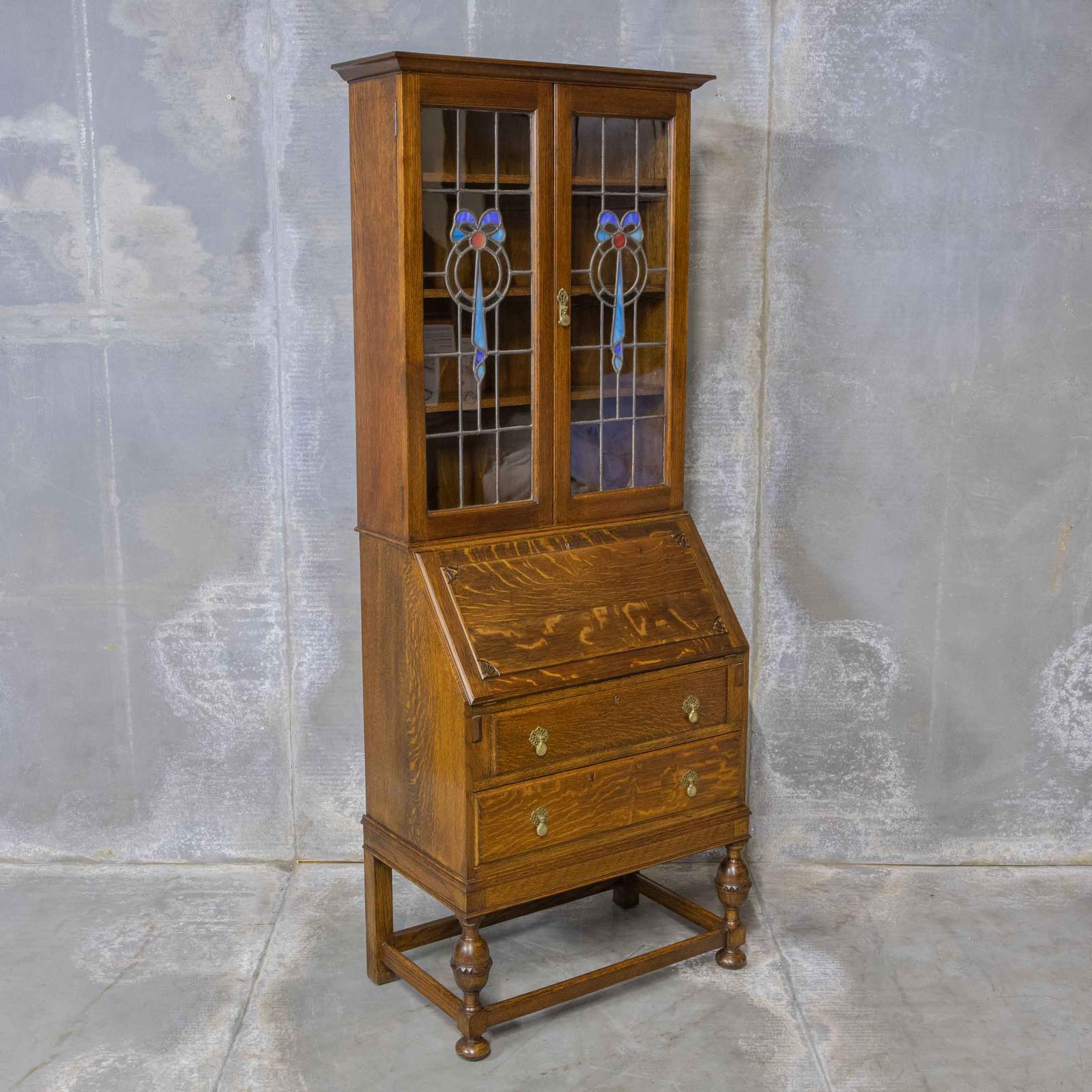 Oak Bureau Bookcase with Stained Windows