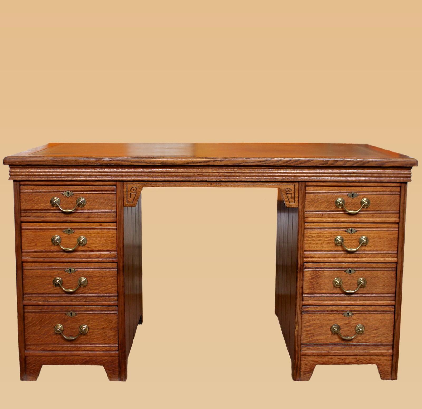 Oak Desk Twin Pedestal Edwardian Carved Green Leather Top