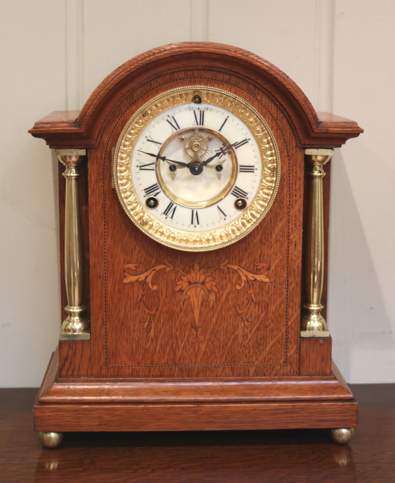 Oak & Inlay Visible Escapement Mantel Clock c.1890