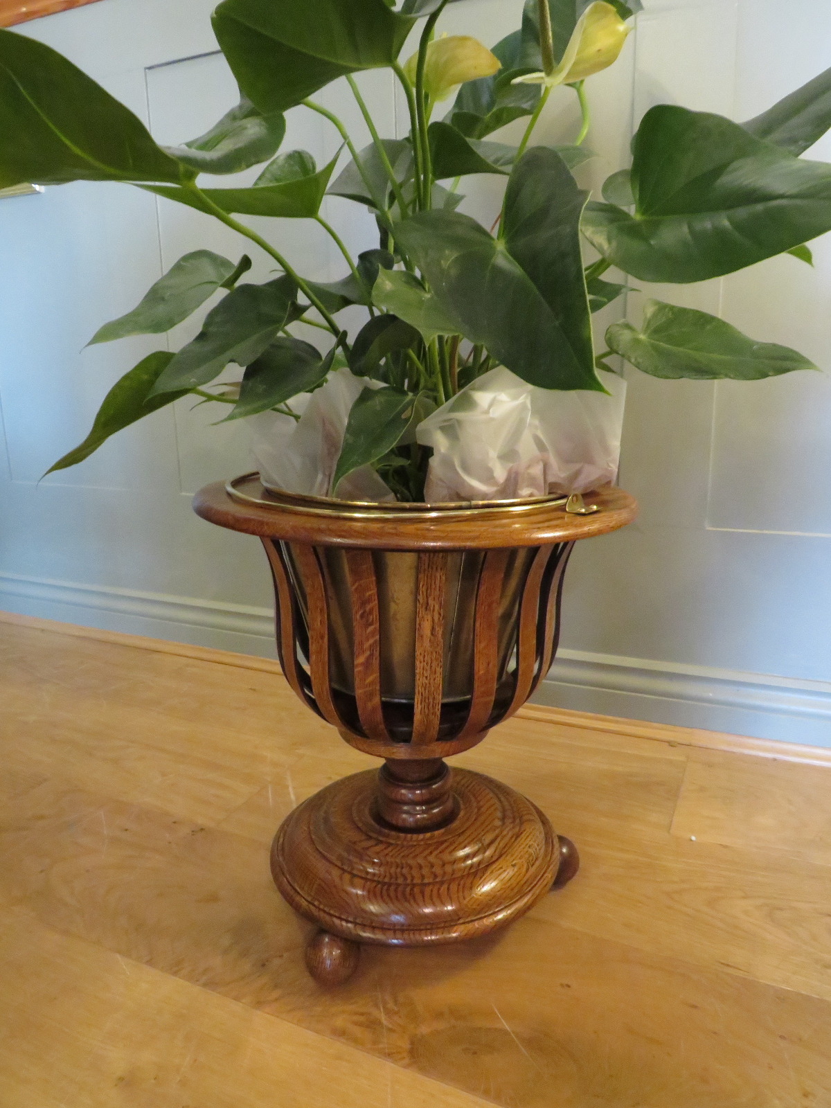Oak Jardiniere Plant Stand with Brass Linner and Swing Handle