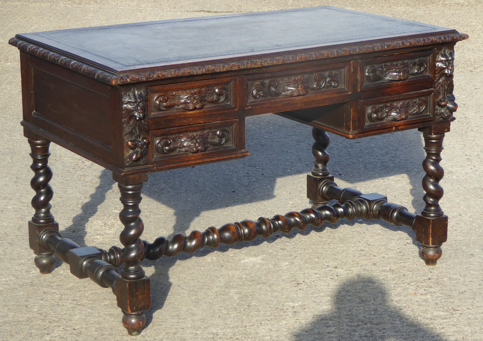 Oak Leather Top Green Man Mask Carved Writing Table / Desk
