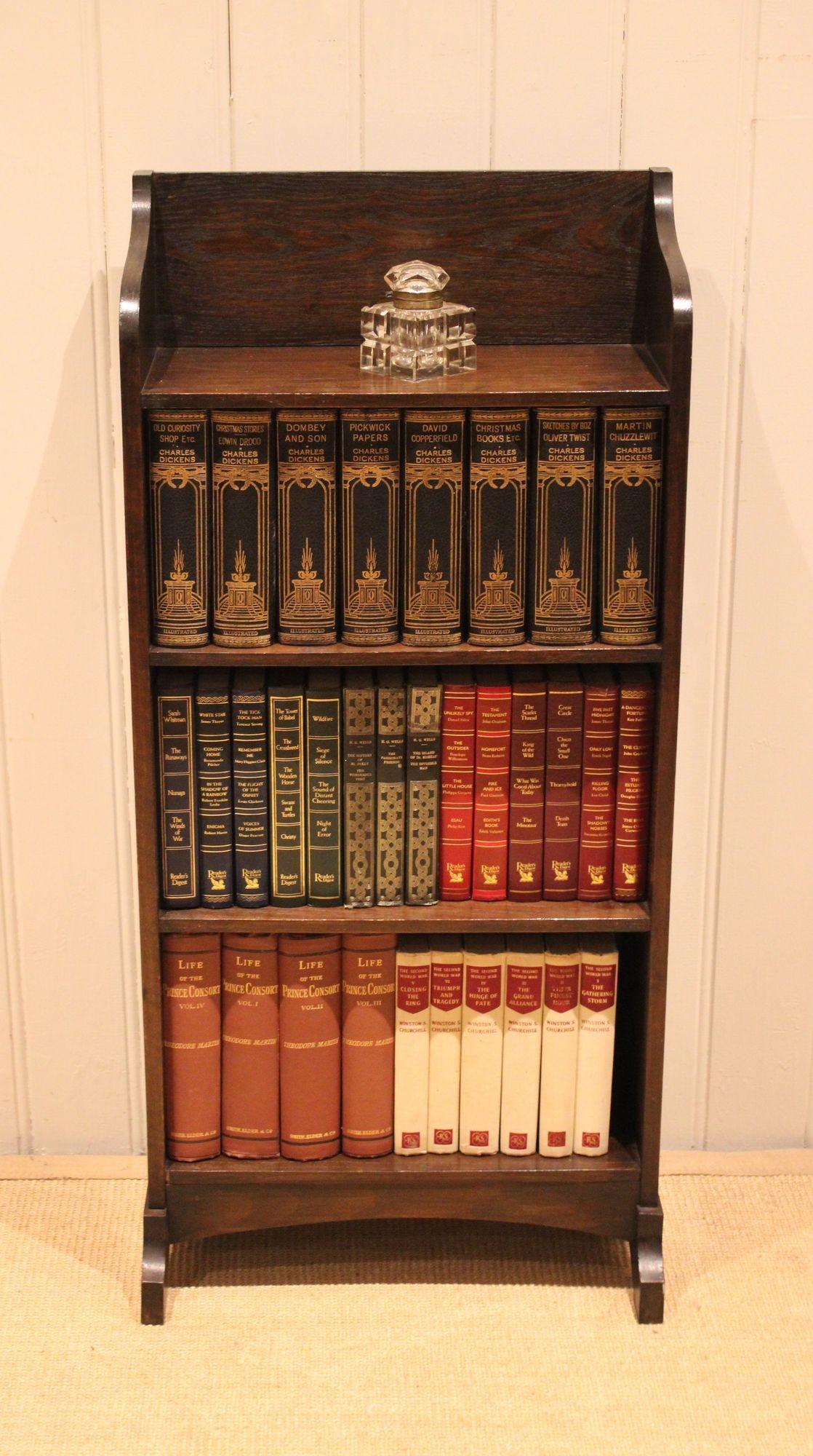 Oak open bookcase having a shaped top with three fixed shelves , raised on shaped feet . The shelf dimensions are 42 cm wide x 18.5 cm deep and from the bottom up 23 cm , 23 cm and at the top 20 cm high.