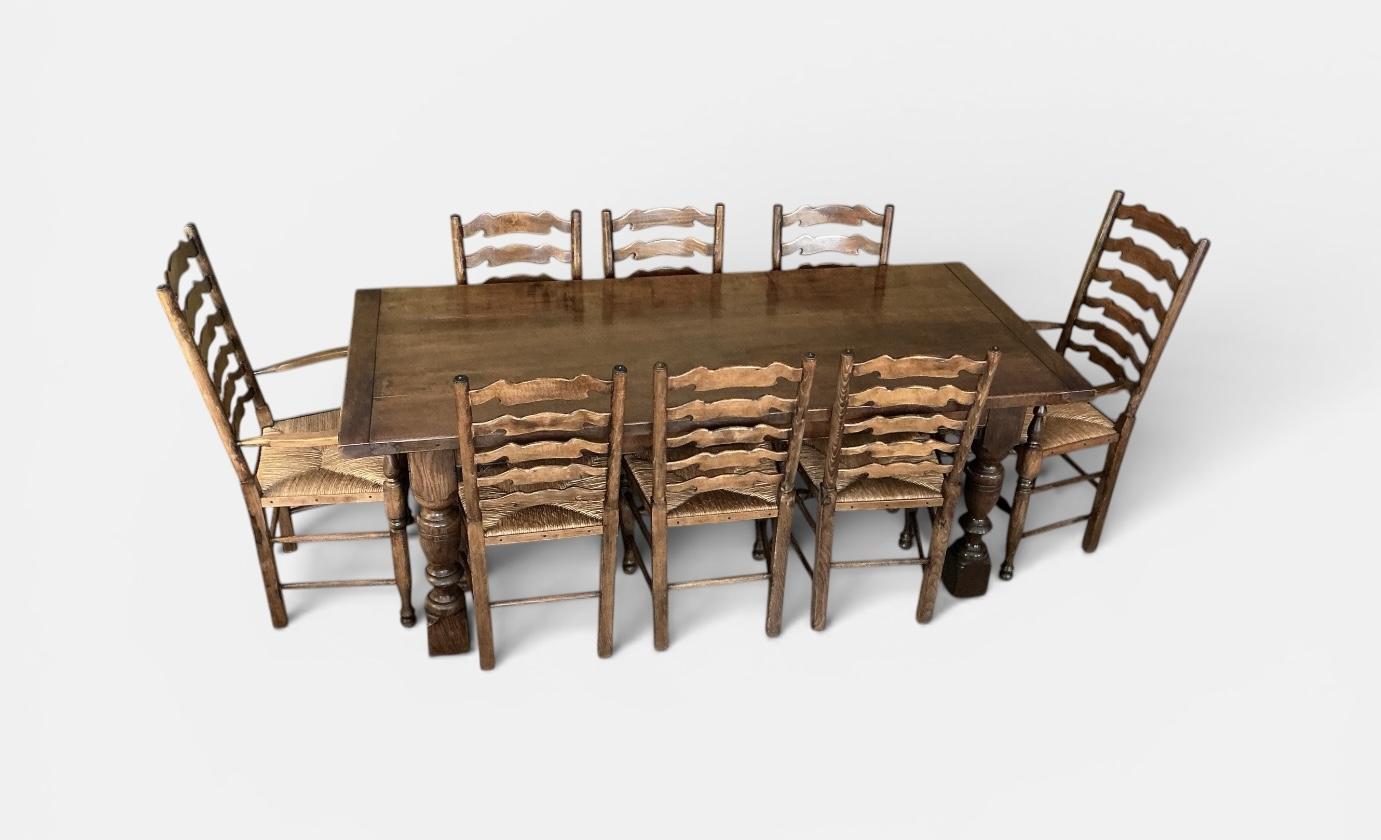 Superb quality solid Oak Refectory table and eight ladder back dining chairs, the table having a plank top with cleated ends and standing on four turned legs with carved brackets to the top, the chairs having a five bar ladder back, rush seats and turned front legs with turned front stretcher,