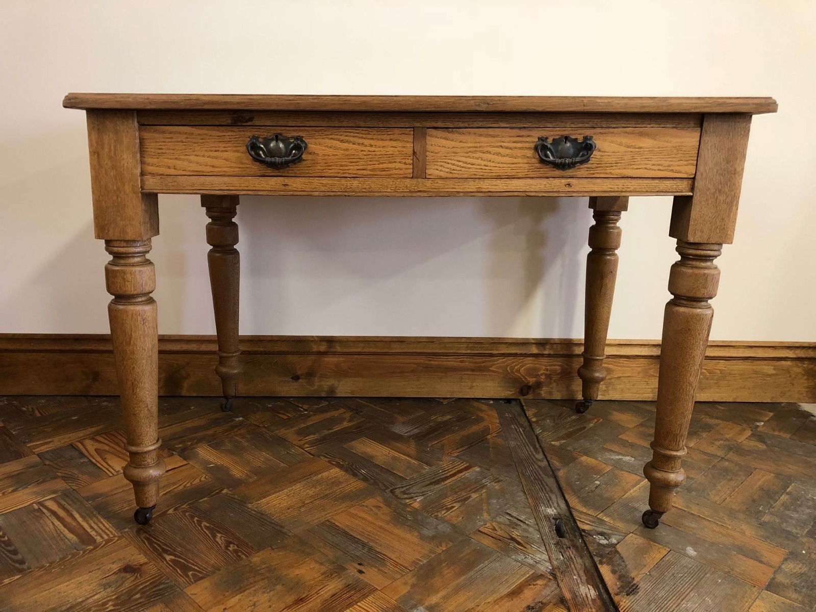 Oak Two Drawer Table On Turned Legs & Castors C.1920 (1 of 1)