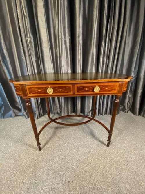 This stunning occasional table featuring a beautifully tooled and aged looking leather hand dyed top in a mottle green bordered in gilt detail , the table has two mahogany lined drawers with gold gilt handles and inlays around of boxwood and satinwood, the table stands on turned legs with beautiful shaped stretcher bars below, This table could be used as a desk, dressing table or would compliment most rooms of your home. Dimensions:- Width 45" 114 cm Depth 24" 61cm Height 30" 76cm