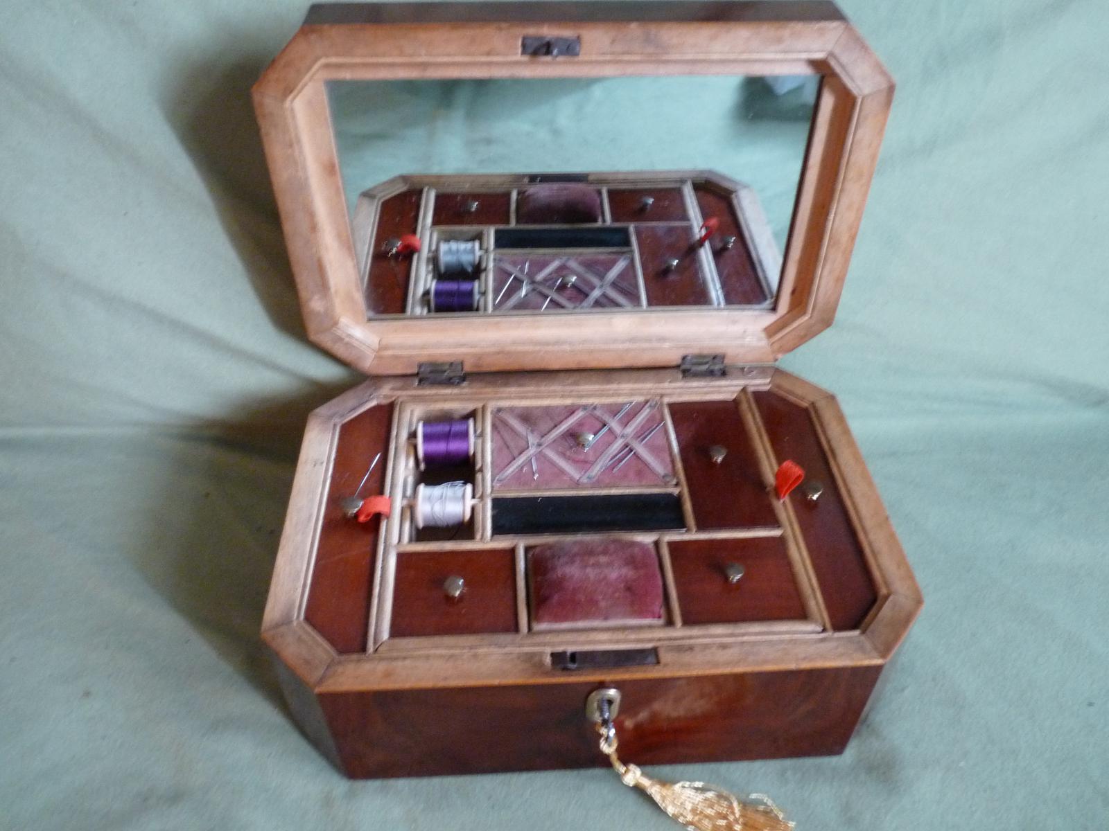Octagonal Flame Mahogany Jewellery - Sewing Box. Original Tray