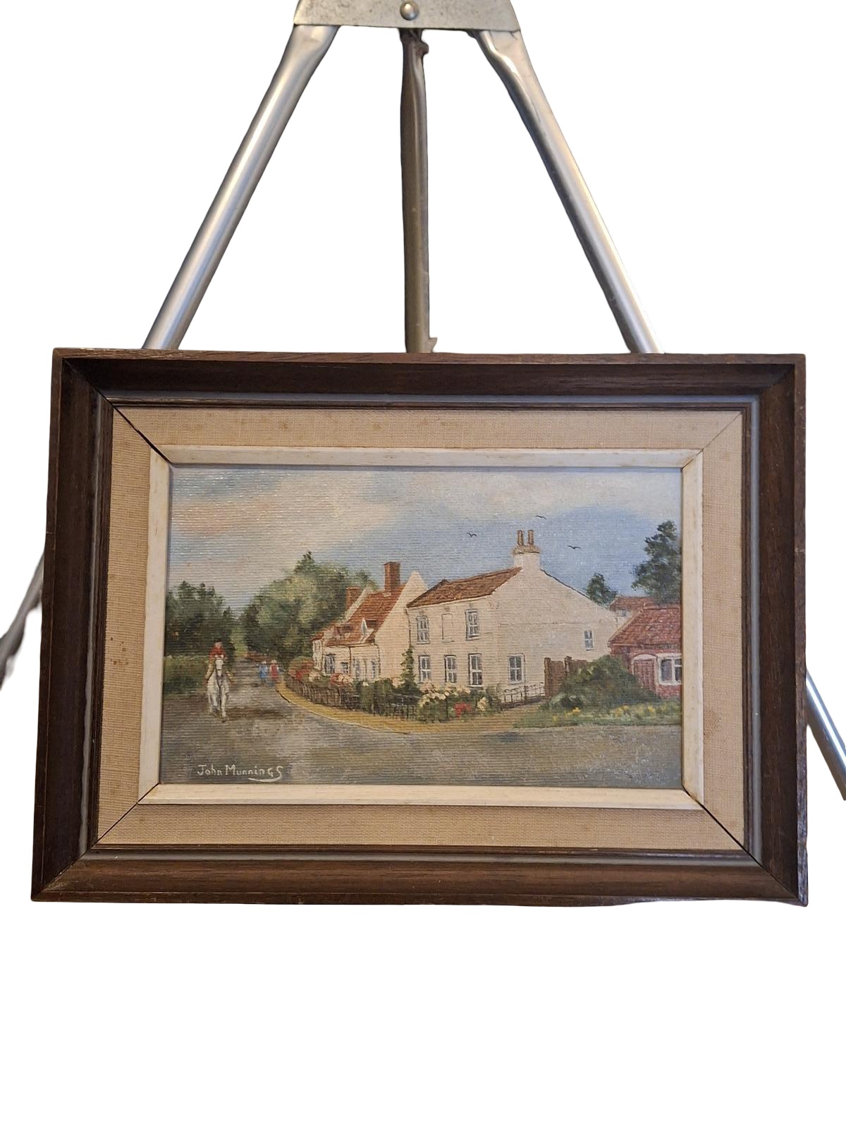 A lovely oil on board of Holton Street, Holton, a small Suffolk village, by renowned artist John Munnings the nephew of Sir John Munnings thr great horse painter. It's a lovely tranquill village scene with a person on horseback and two people walking down the street it has the artists details on the back and is signed in the bottom left hand corner of the painting, it is in good condition and measures 19 x 12 cms and 27.5 x 20 cms framed thanks for looking