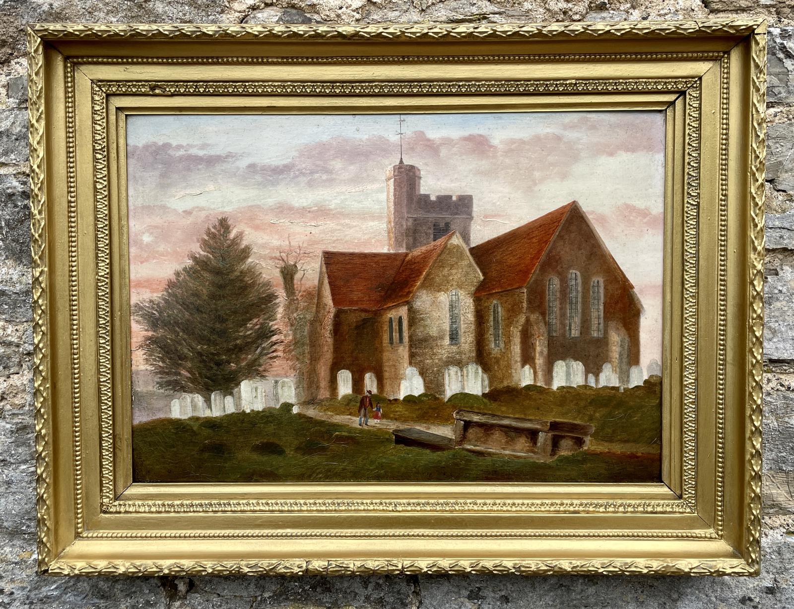 Oil on Board of Broughton-under-blean Church by F.Baker 1869