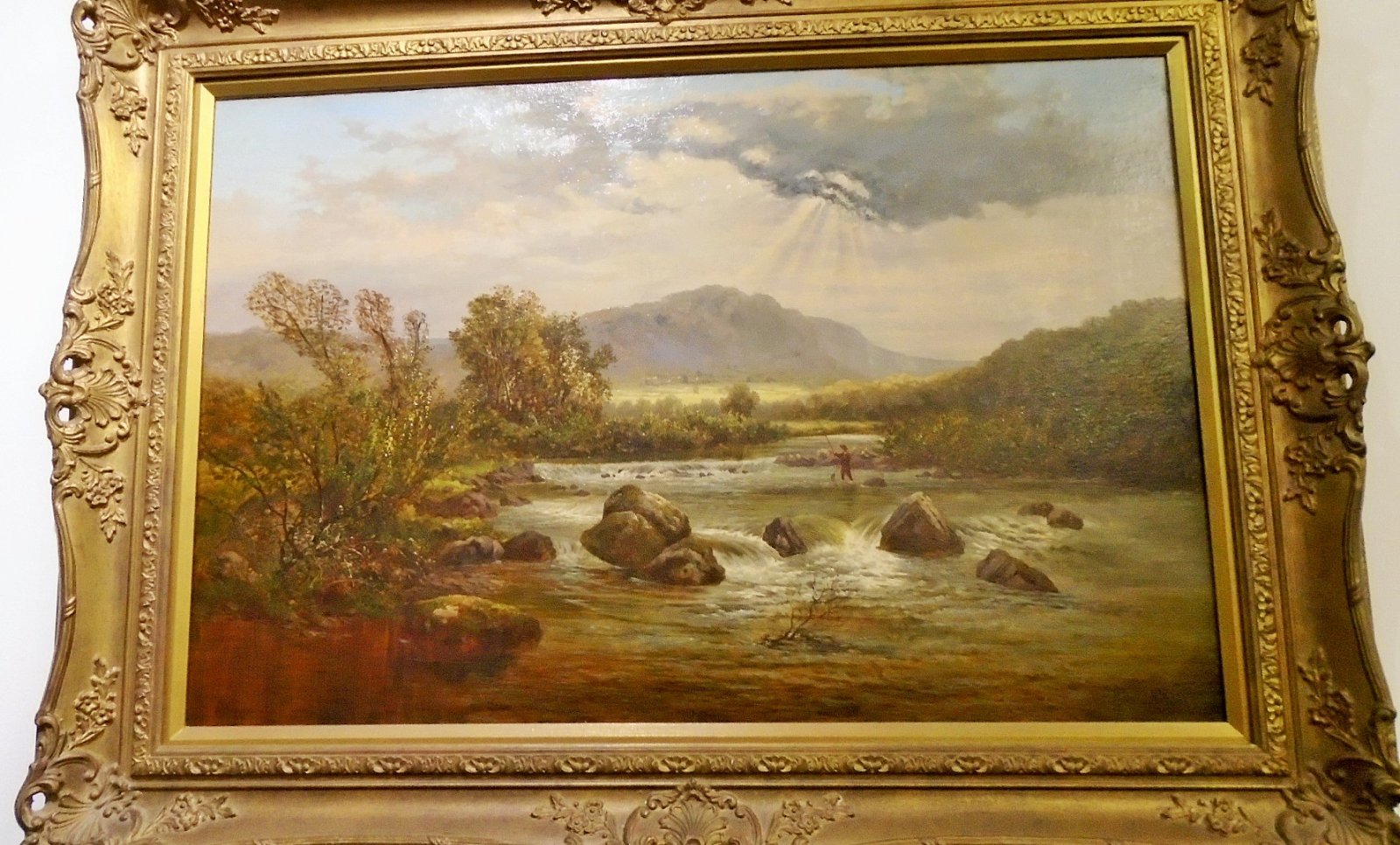 Oil on Canvas Salmon Fisherman in River Landscape
