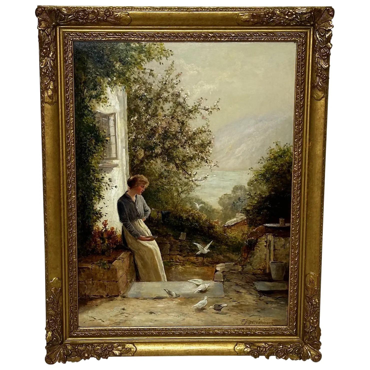 Oil Painting Farmers Wife Lady Feeding The Doves by Ernest Charles Walbourn