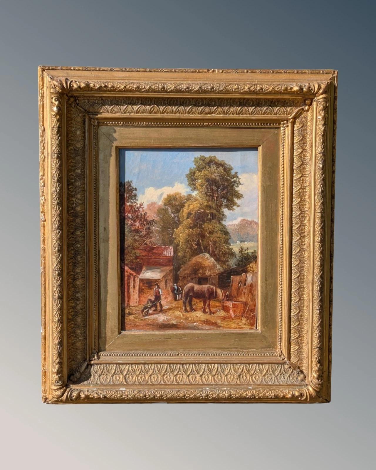 The painting is signed by the artist Strafford Newmarch who was active between 1861 and 1895. This work is signed and dated 1874 and depicts a typical Victorian farmstead with figures labouring and a horse drinking from a trough in a yard. The painting is in delightful warm colours and is in its original frame which is in excellent condition.