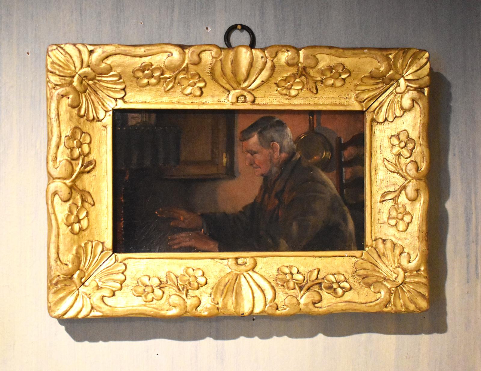 A charming oil on artist board depicting a man warming his hands by the fire, painted by the artist Walter Farmer 1870-1947. The work is wonderfully detailed with superb work on the figure and the light cast by the fire. The piece is in very good condition just a slight concave bow to the board. The painting is signed and dated to the lower right 1899.