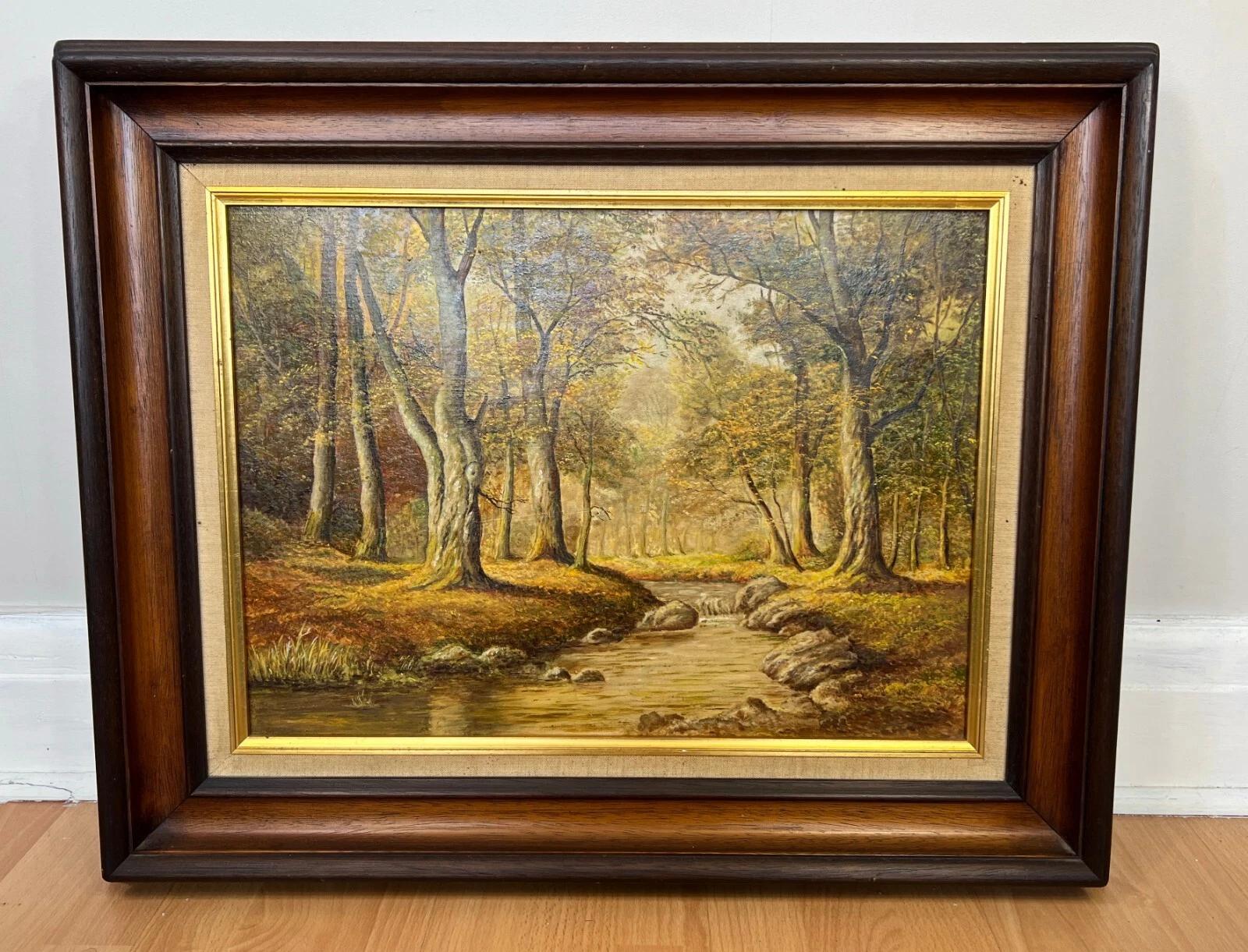 A beautifully detailed Vintage oil painting, capturing a serene woodland landscape with flowing stream and autumnal tones, presented in a classic framed setting that enhances its warm and timeless character. Offered in Good condition – wear to frame as photographed. It shows gentle signs of age while remaining an attractive and decorative display piece.