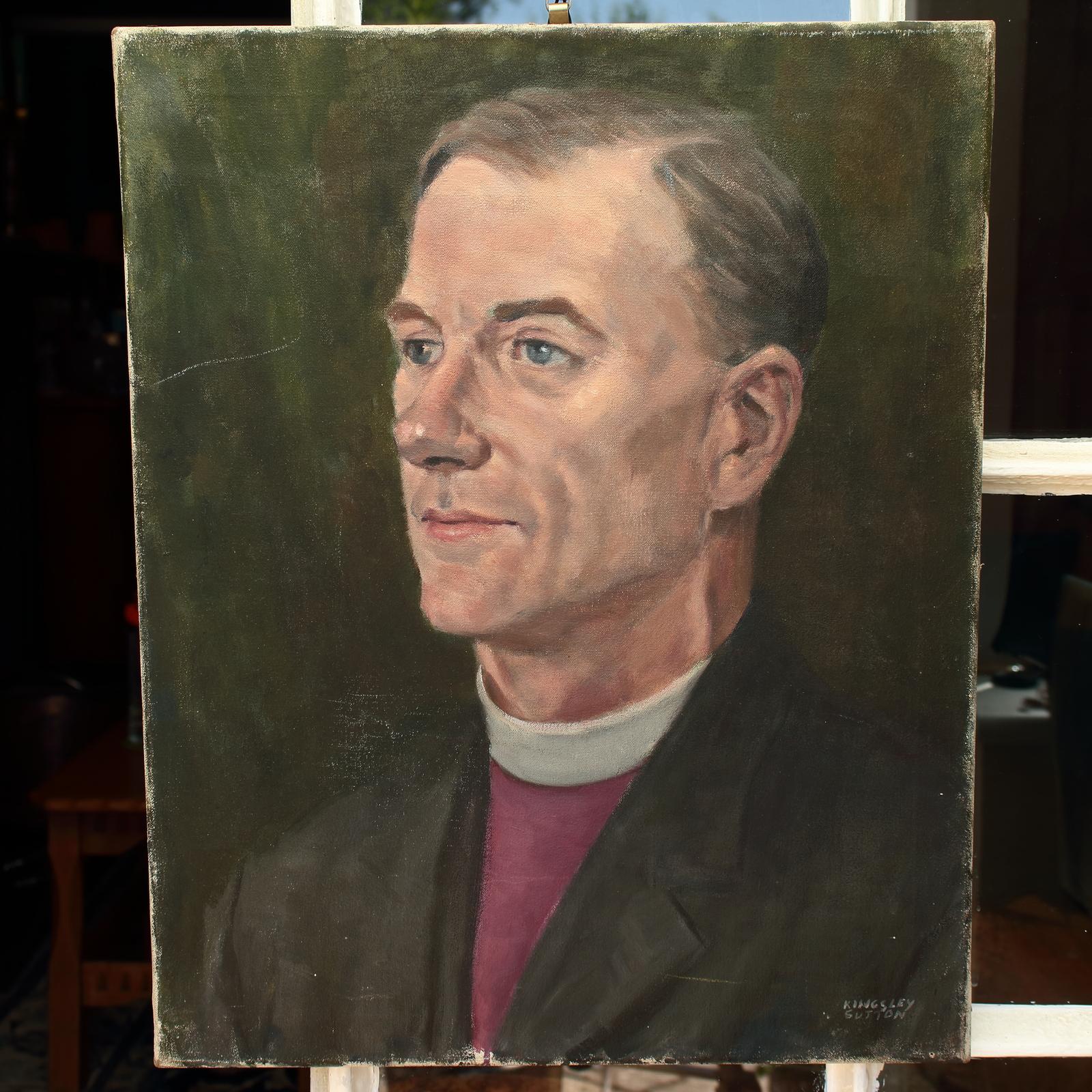 Oil on canvas portrait of Rt. Rev. Roderic Norman Coote who held the position of Bishop of Fulham between 1957 and 1966, painted by John Kinsley Sutton, mounted and unframed.
