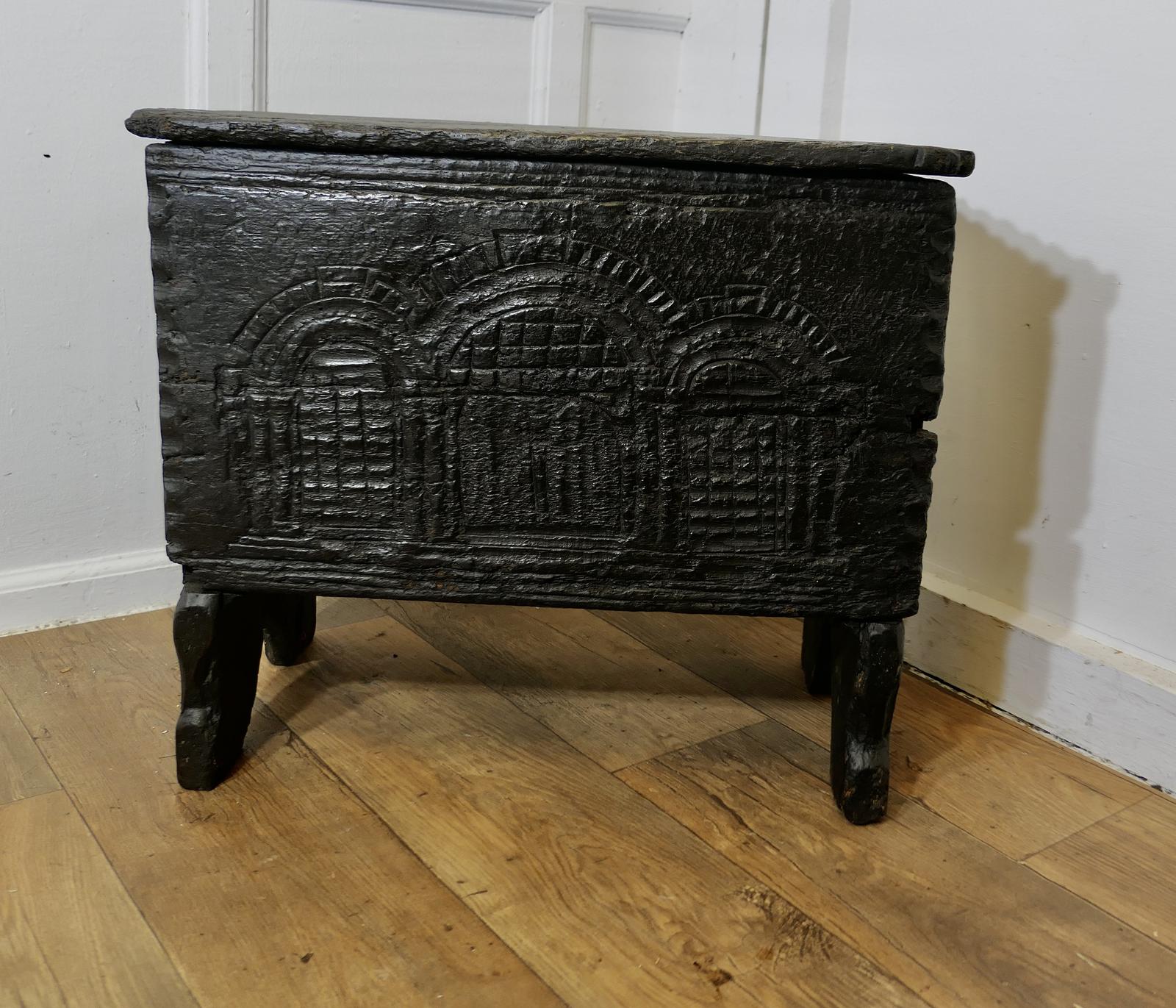 Old and Primitive Carved 16th Century 5 Plank Oak Coffer