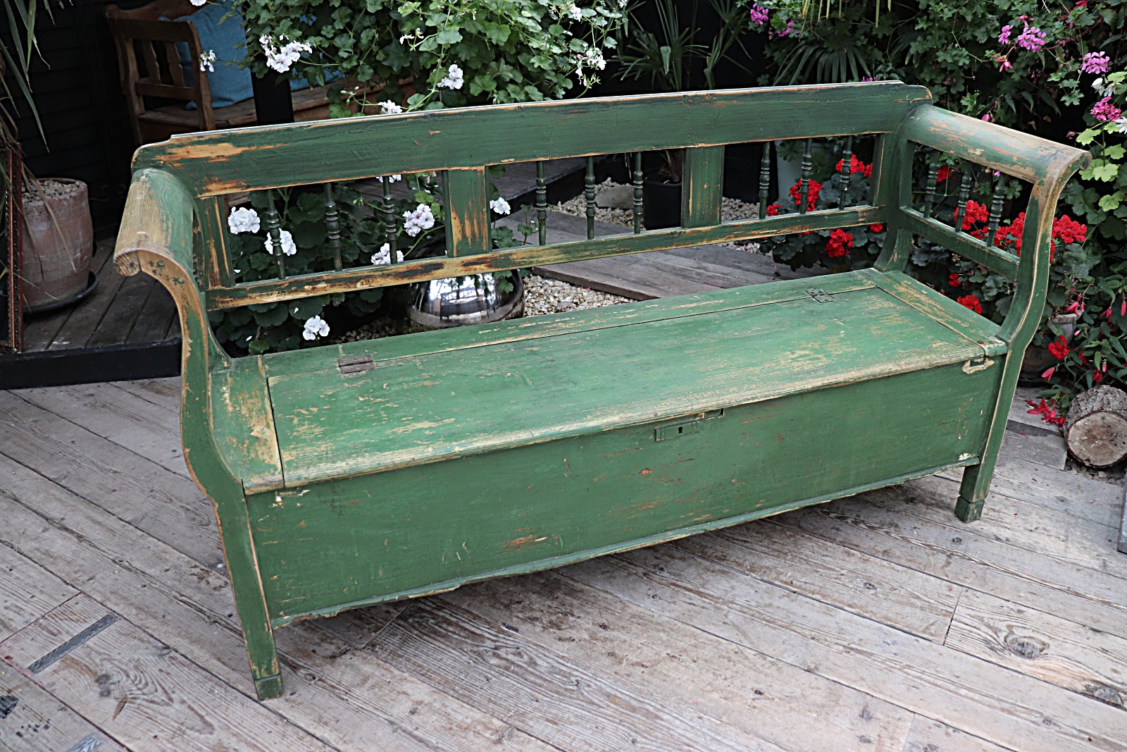 Old Antique Pine/Green Painted Hungarian Box/ Storage Bench/ Settle- We Deliver!