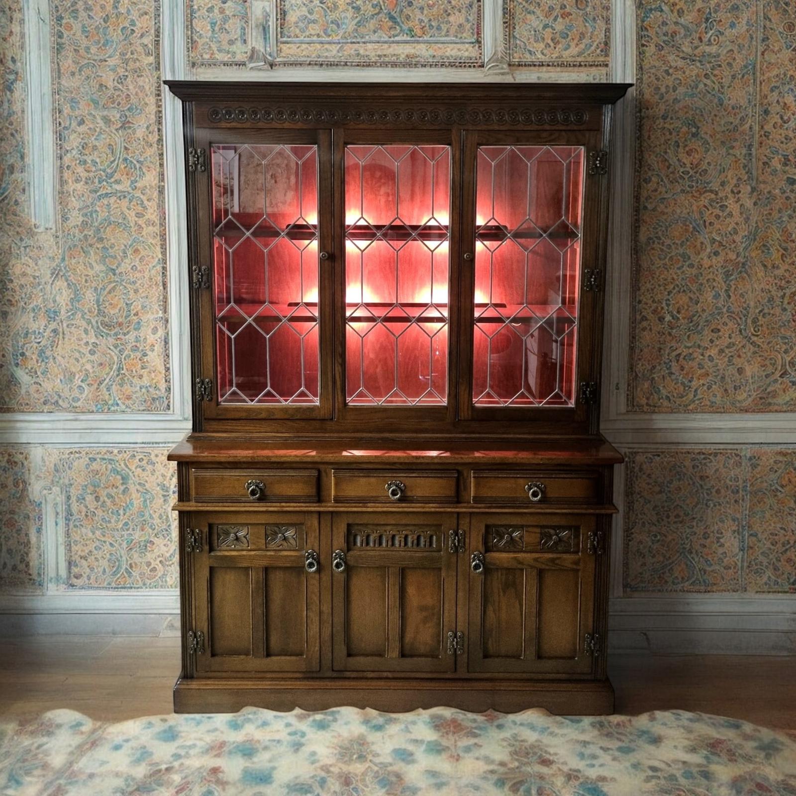 Old Charm Wood Brothers Lancaster Glass Display Cabinet / Sideboard / Tudor Brown Oak