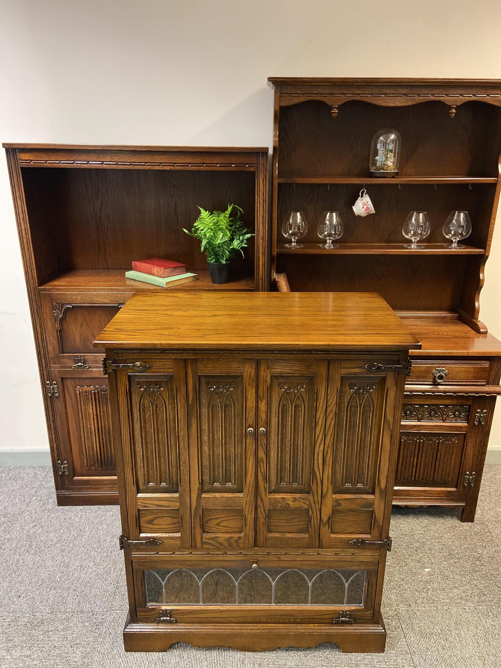 Old Charm Wood Brothers / Oak Tallboy Linen Fold Cabinet TV Cupboard / Drinks Cabinet / Light Oak 1960s