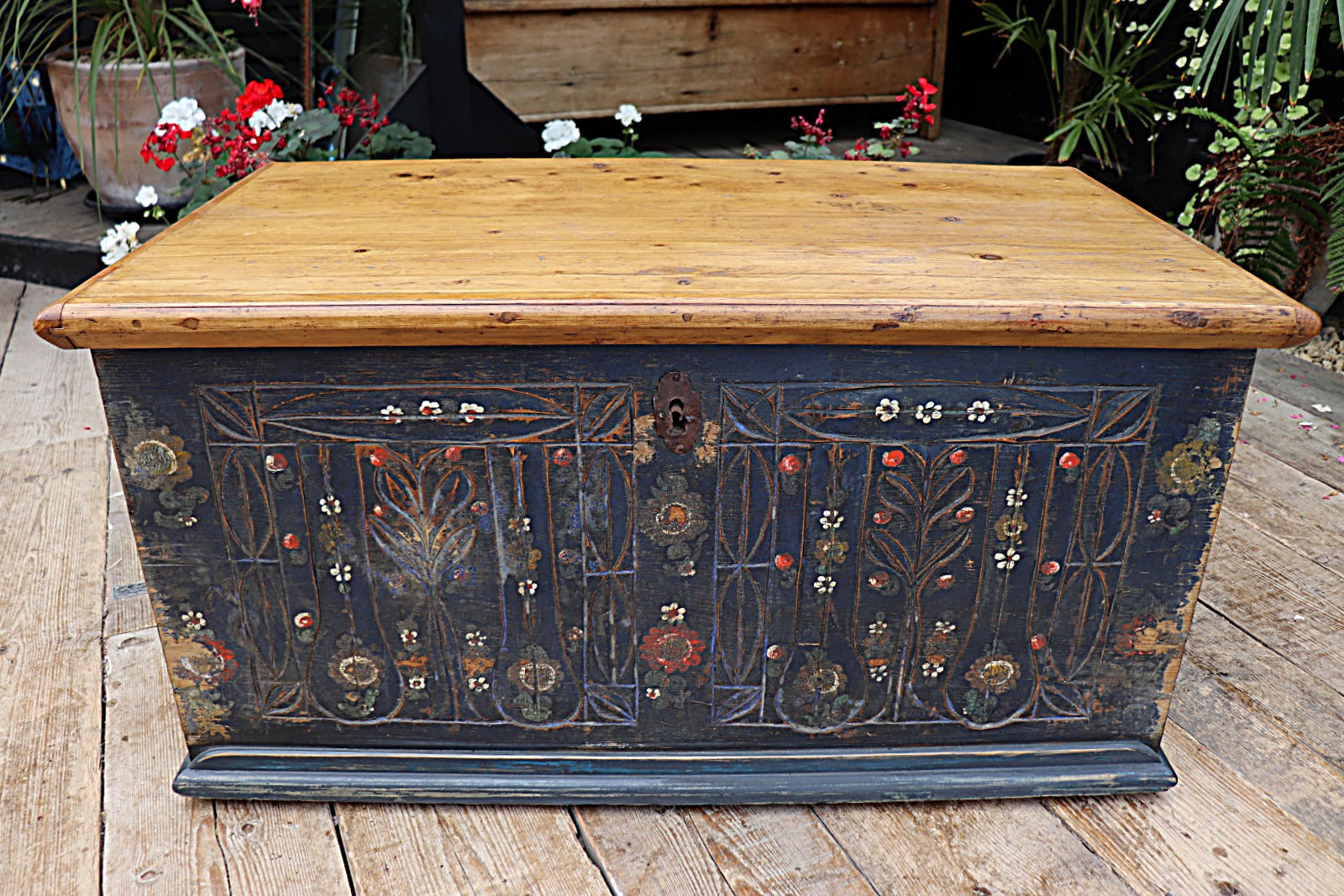 Old Floral Decorated / Blue Marriage Chest Pine Blanket Box / Trunk - We Deliver!