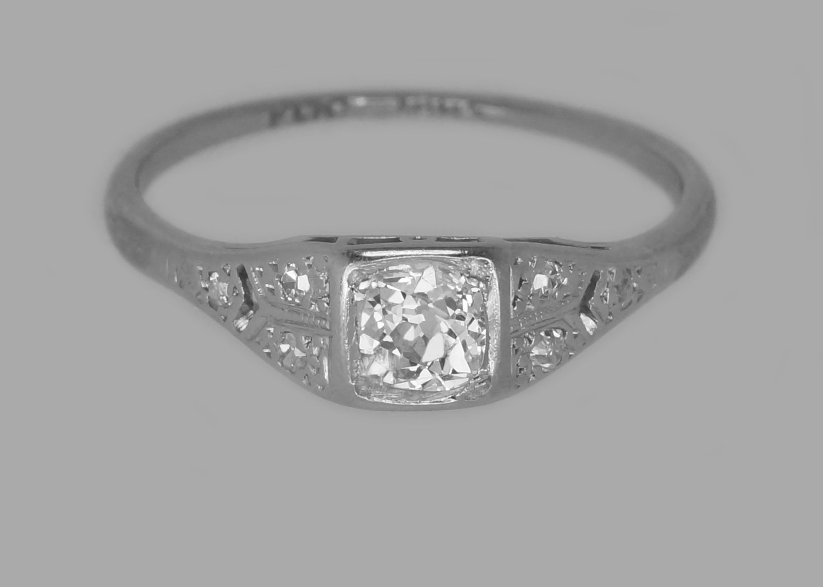 Old Mine Cushion Cut Solitaire Diamond Ring 1920's 18ct Gold & Plat Antique Ring