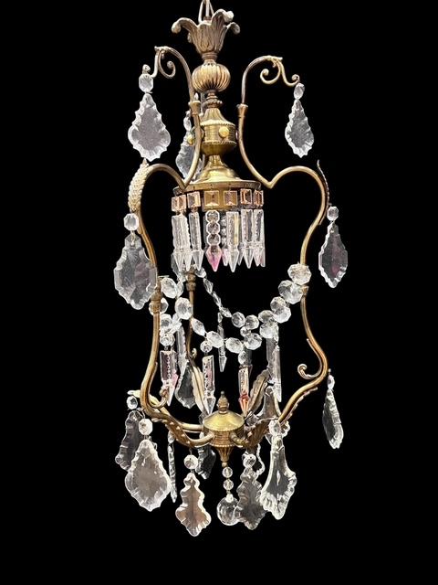 An unusual Italian antique chandelier with a top ornate brass finial with three scrolling arms each holding a large French slab drop, The curvy brass frame is decorated with leafy features, the single bulb is shrouded with a row of half cut Albert crystals and an unusal pink spear crystals. The chandelier is dressed with large French slab drops and a row of large crystal buttons from which hang pink tipped half cut Albert drops. The bottom brass boss has an elegant finial and this fabulous chandelier is finished off with a faceted crystal ball. c1920's. Restored, wired, pat tested and ready to hang.