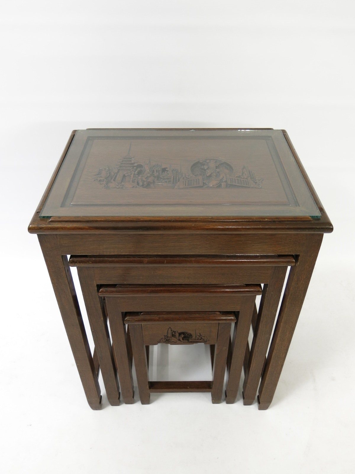 Oriental Quartetto Nest of 4 Tables with Carved & Glass Tops + Drawer