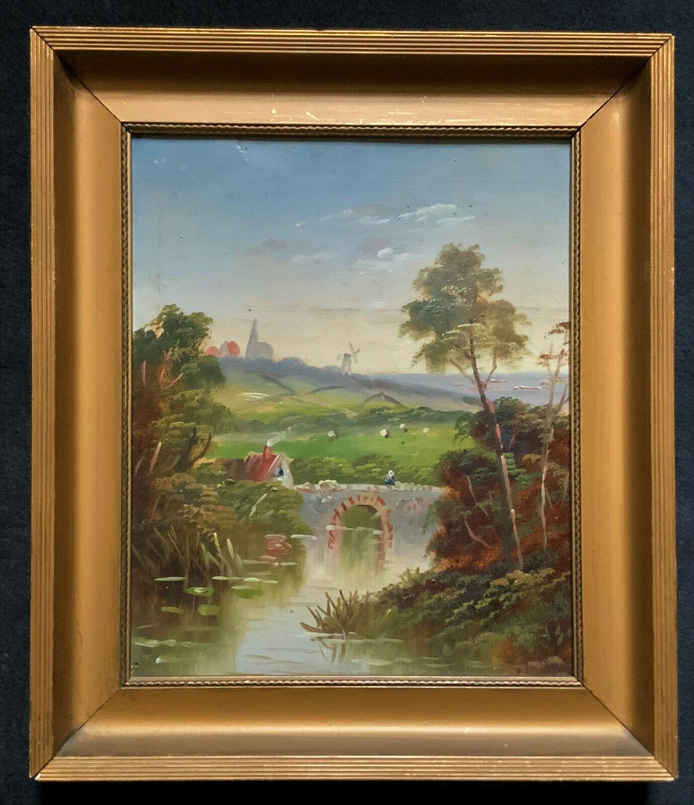 Original 1900s Oil on Board Painting of a Dutch Windmill & Canal Landscape