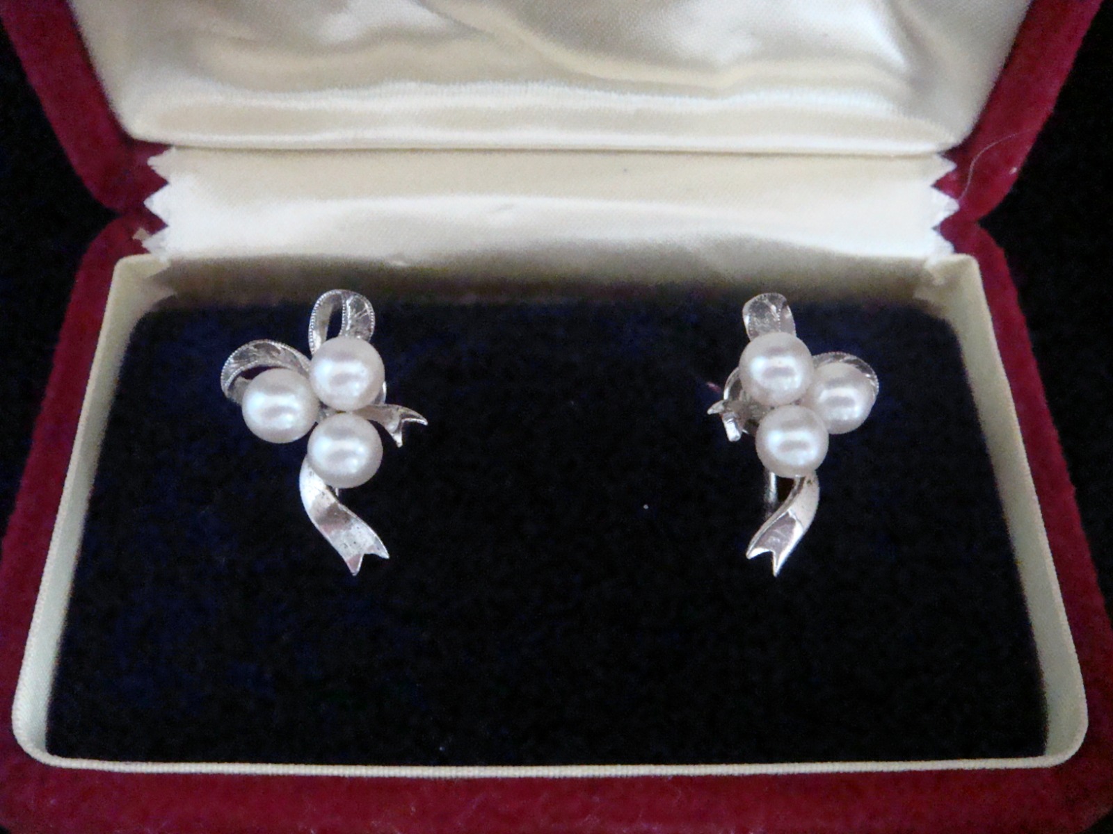 Original 1930s Silver Mikimoto Cultured Pearl Earrings Original Case