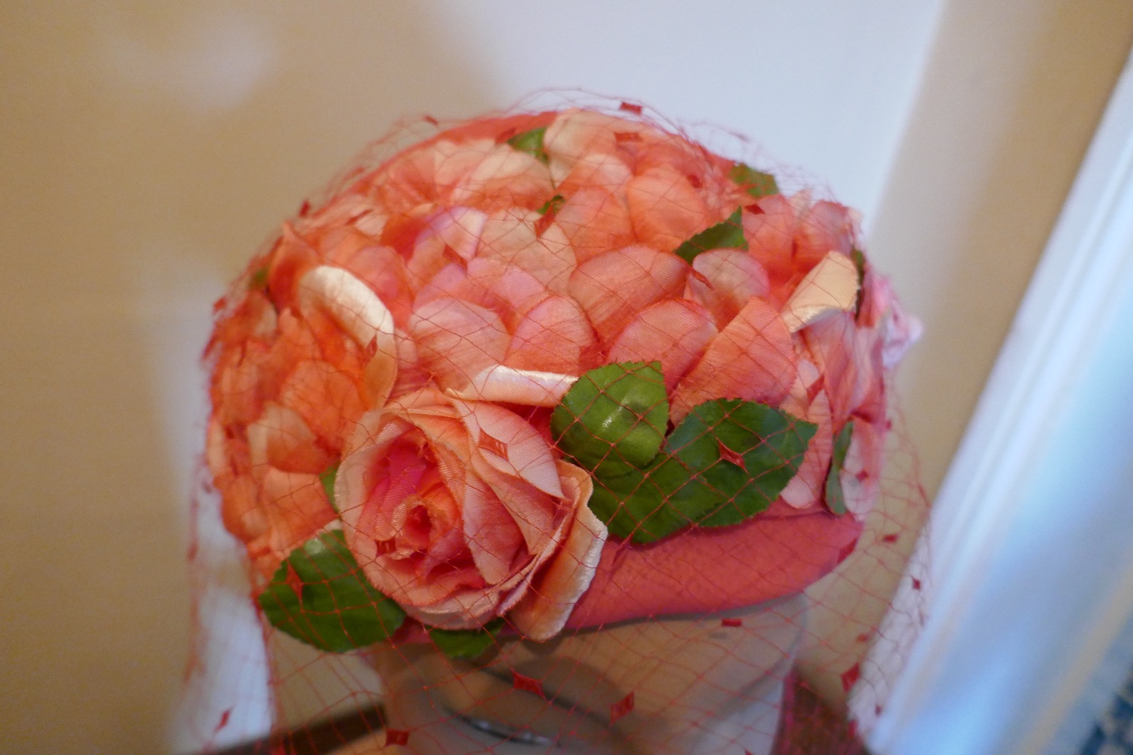Original 1960s Pink Pill Box Hat, Decorated with Roses & Veil by Connor