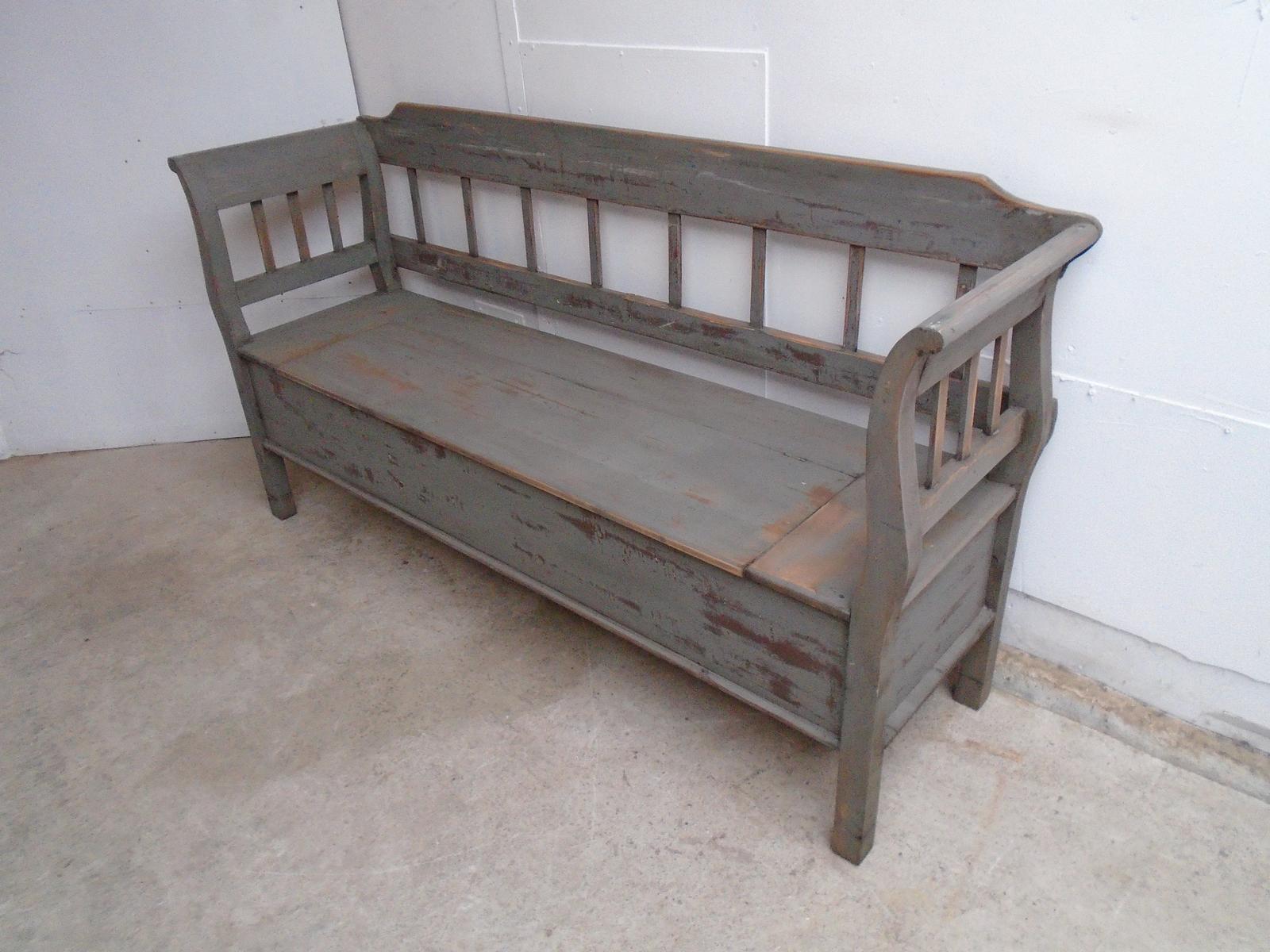 Original Antique Pine Grey & Brown Victorian Box Settle / Hall Bench
