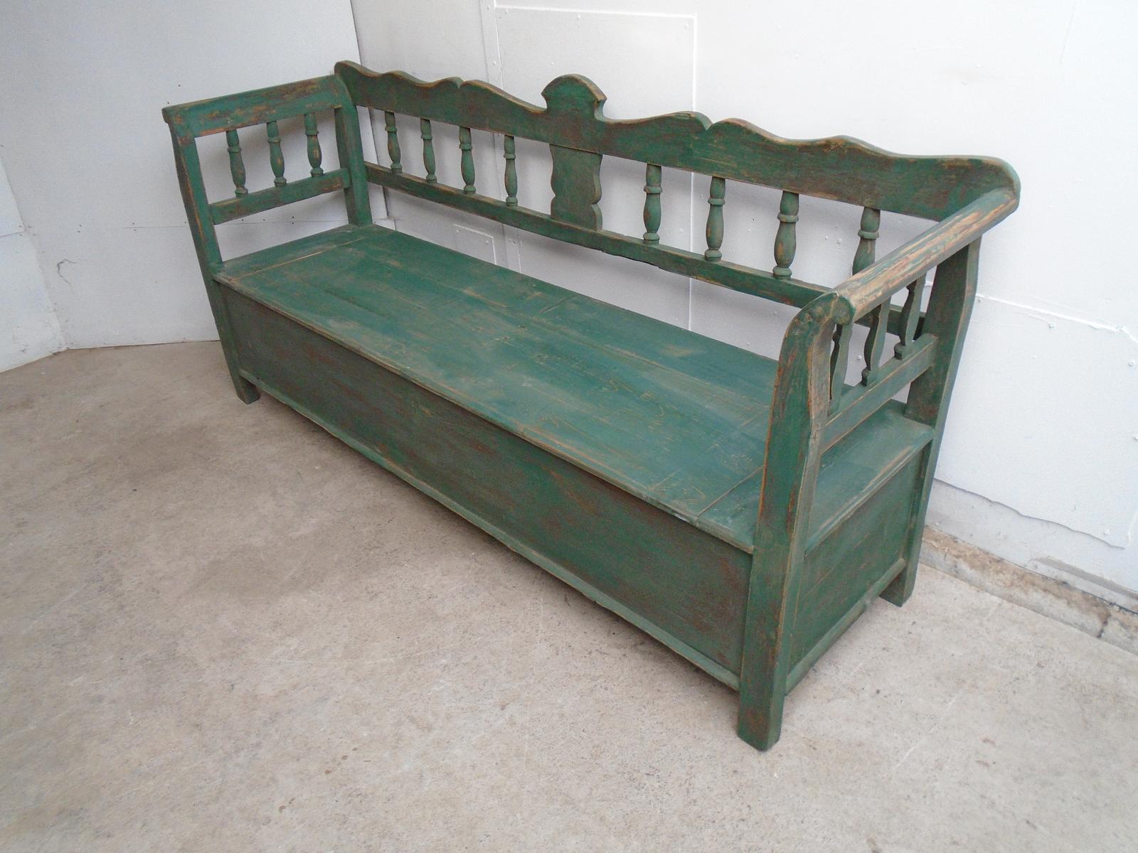 Original Antique Pine Painted Green Victorian Box Settle / Hall Bench