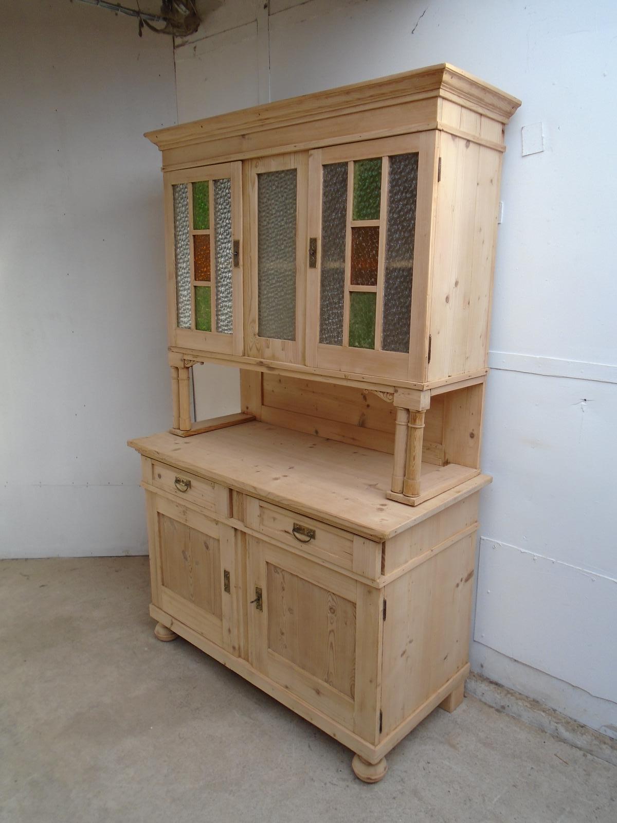 Original Antique Pine Stained Glass Arts & Crafts Kitchen Dresser to wax / paint