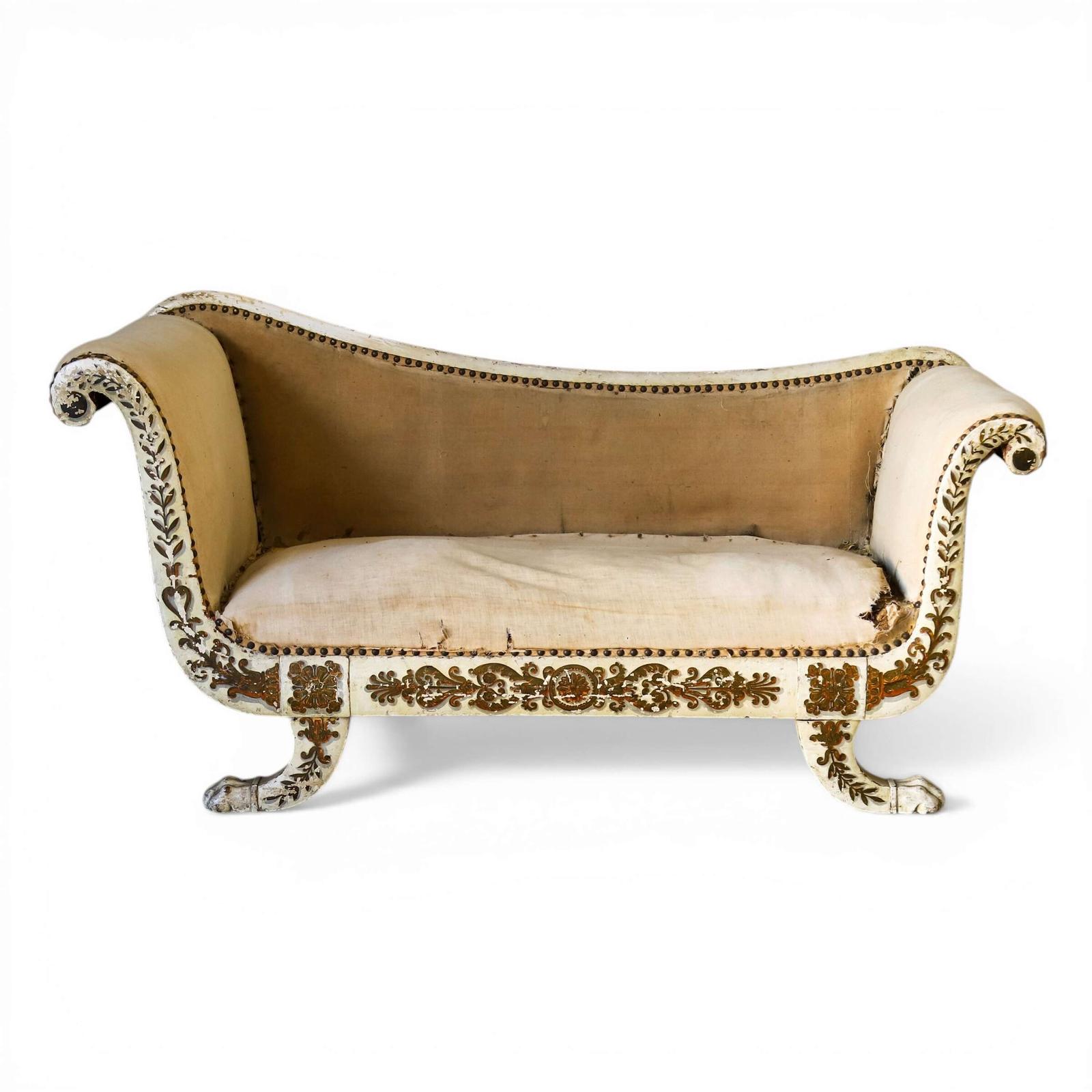 A graceful and evocative 19th‑century French sofa or chaise, retaining its original painted frame with softly timeworn decorative detailing and traces of gilded ornament. The carving is confident and refined, with four outswept supports ending in lion paw feet - a sculptural Neoclassical motif that lends both strength and elegance to the silhouette.