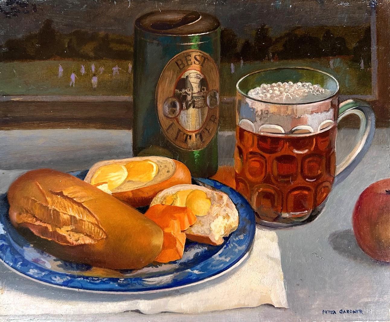 Original Acrylic on Board’bottles, Fruit and a Chair’ by Irene Stocks. B. 1943. Signed c.1980